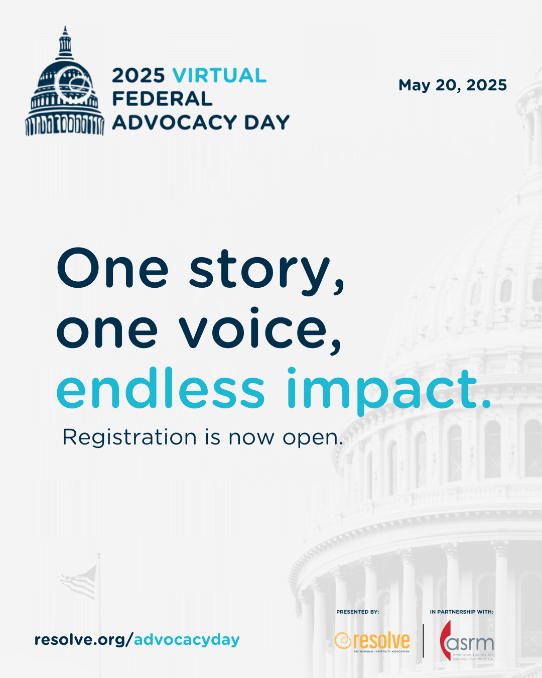 A RESOLVE virtual Federal Advocacy Day is an interactive online event that brings together RESOLVE volunteers and champions. This will be an engaging event held entirely online rather than at a physical location. Advocates will have the opportunity to network with other advocates in addition to meetings with their legislators.