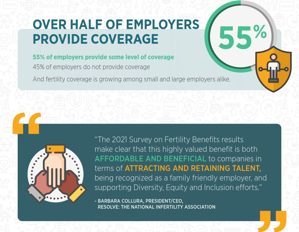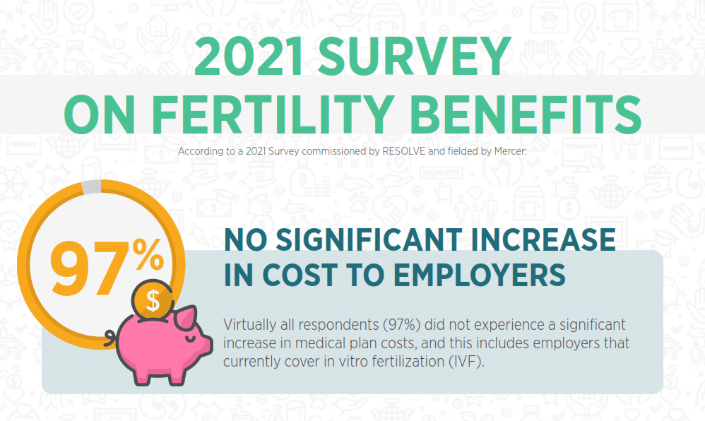 Learn about the cost of not offering fertility insurance benefits. According to a survey commissioned by RESOLVE of 702 employees who needed IVF to build their families, those without employer-provided fertility insurance coverage often expressed dissatisfaction and, in some cases, the desire to look for new employment opportunities with employers who provide coverage.